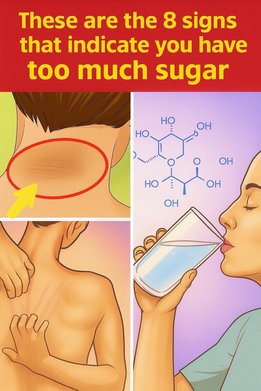 High sugar levels cause inflammation in the body, which can show up as skin problems like acne, redness, or chronic itching. Sugar also affects collagen, accelerating skin aging.