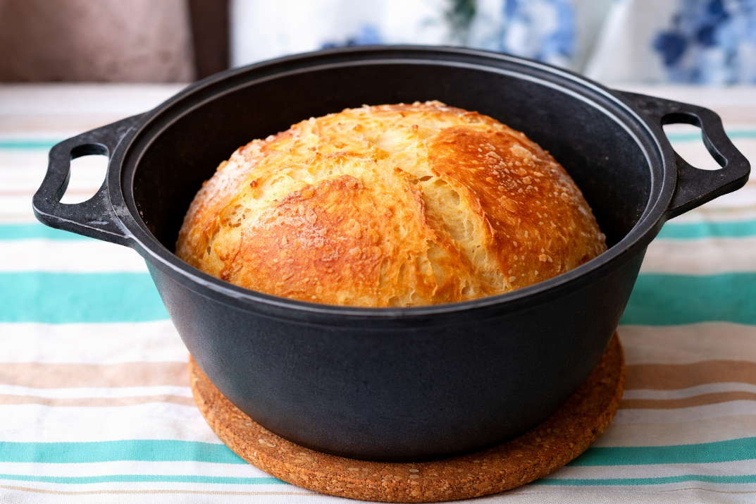 Because the bread bakes inside a heavy cast-iron Dutch oven, the trapped steam helps create the signature crust and texture often associated with artisan bakery loaves. The result is a flavorful bread that looks and tastes impressive while remaining easy enough for beginners.