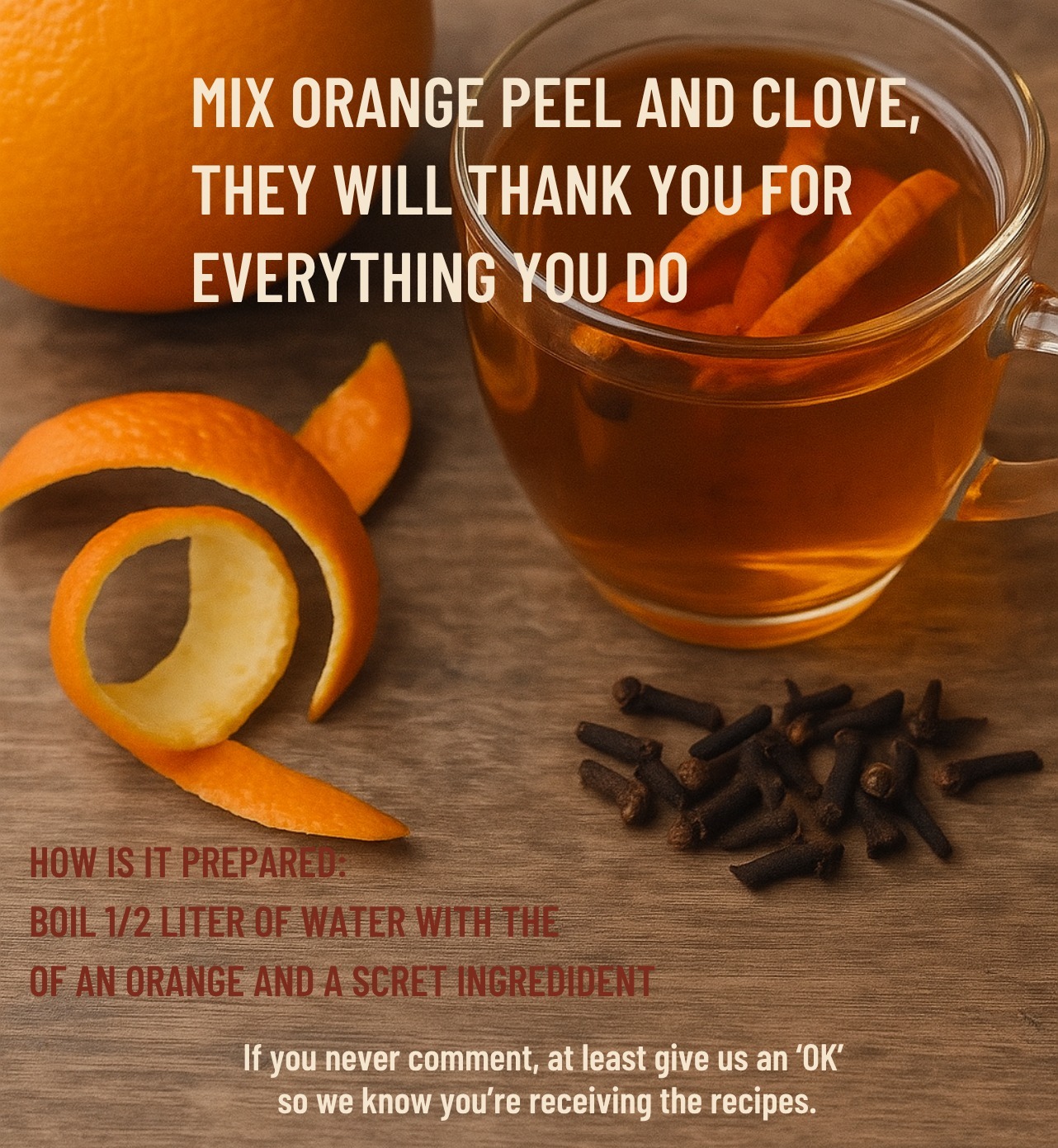 Orange peels contain a surprising amount of vitamin C — even more than the fruit itself. This makes them a potent ally in keeping our immune system strong. Cloves, meanwhile, are widely known for their antimicrobial properties, helping fight off infections. Together, they form a comforting and effective blend to ward off colds, coughs, and the flu.